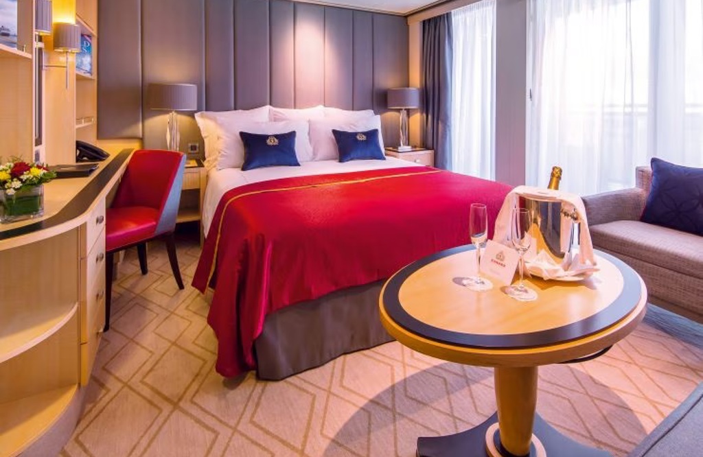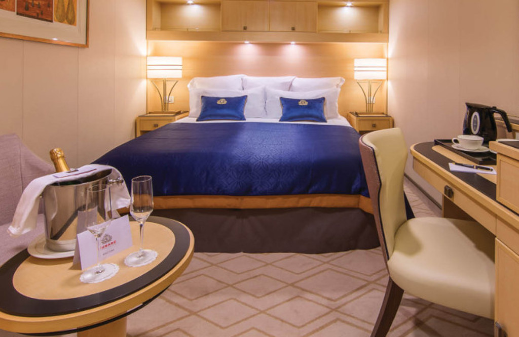 Relax in complete peace and comfort, cocooned from the stress of the everyday. The Britannia Standard Inside staterooms have two beds on Queen Victoria, and one bed on Queen Mary 2, a desk area with seat and a shower.