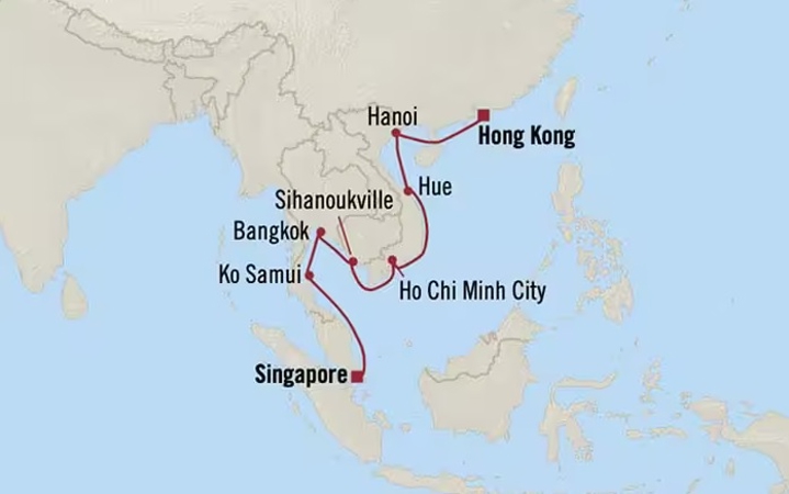 Discover the lush paradise of Ko Samui, explore the magnificent golden temples and palaces of Bangkok, relax on the tropical beaches of Sihanoukville, visit the tombs of the Nguyen dynasty emperors in Hue, and soak in the vibrant energy of Ho Chi Minh City. After sailing into the magnificent Hong Kong, enjoy the modern marvels and ancient wonders, with a two-night hotel stay before your flight journey home.