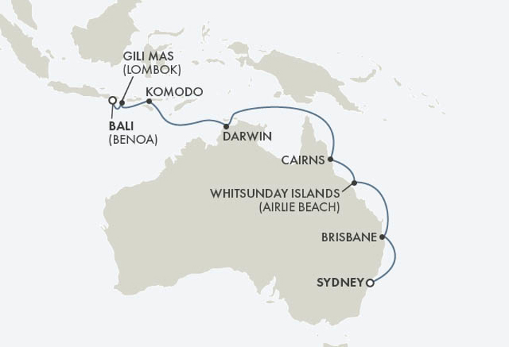 Commence a captivating voyage where East meets West, with your first stop in the sun-soaked paradise of Bali, a destination that draws every type of traveller with its stunning beaches and vibrant culture. Your journey continues to Komodo Island, home to the legendary Komodo Dragons. From here, continue your Australian adventure with a stop in Darwin, located in the Northern Territory, where you can encounter crocodiles, immerse yourself in Aboriginal culture, and explore the city's galleries and museums. As you sail toward your final destination of Sydney, be sure to explore the tropical beauty of Cairns, the charming seaside town of Airlie Beach, and the dynamic city of Brisbane.